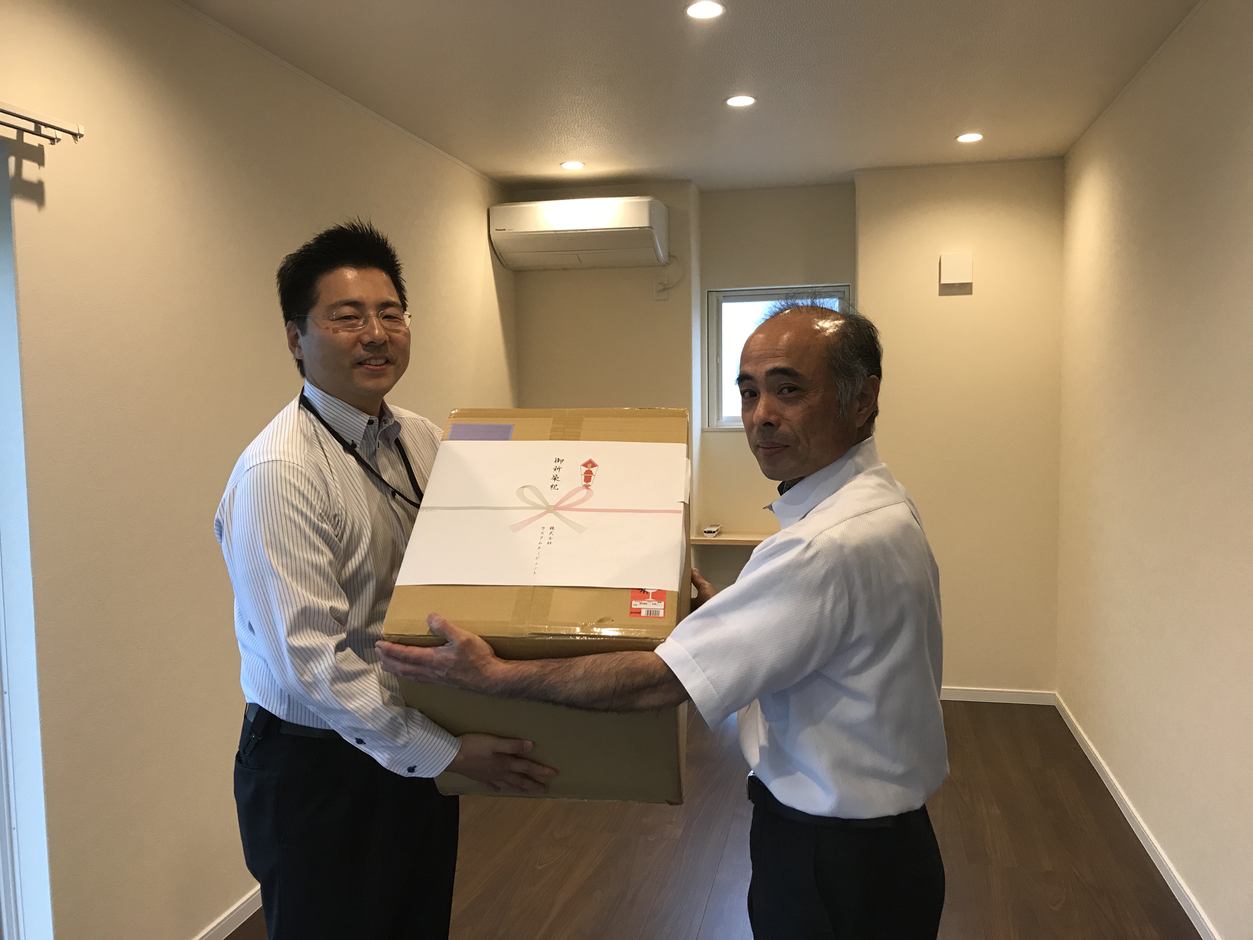 感謝を込めて、営業担当の植木さんよりO様に記念品をプレゼント。