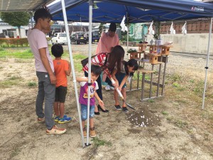工事の無事安全を祈願して、ご家族で鍬入れの儀式を行いました。