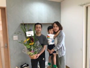 まずは、営業担当の吉田さんからS様ご家族にお花のプレゼント。