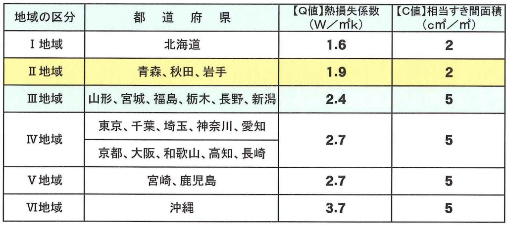 山形県はⅢ地域に該当するので、Q値 2.4W/㎡k ・ C値 5c㎡/㎡ 以下というのが、一つの指標になる訳です。